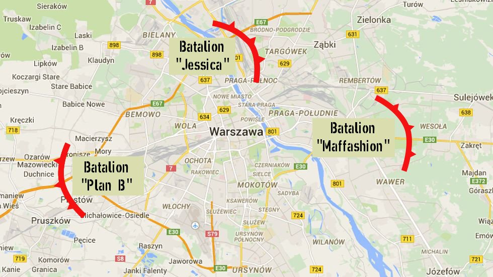 Według tej informacji, młodzi wystawili trzy bataliony na spodziewanych kierunkach natarcia: batalion "Maffashion" broni drogi E30, "Jessica" trzyma E67 na wschodzie a przy węźle Konotopa na zachodzie stolicy działa batalion "Plan B".