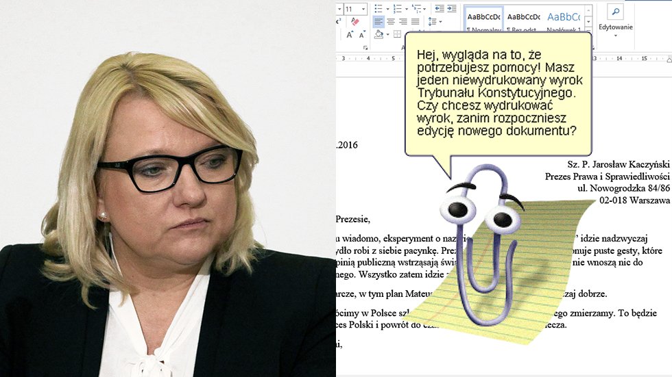 – Za każdym razem od trzech miesięcy, kiedy włączam edytor tekstu i chcę napisać list do Prezesa, w okienku pokazuje mi się informację o niewydrukowanej opinii Trybunału – żali nam się Beata Kempa, szefowa KPRM. – Co doprowadza mnie na skraj załamania nerwowego – dodaje.