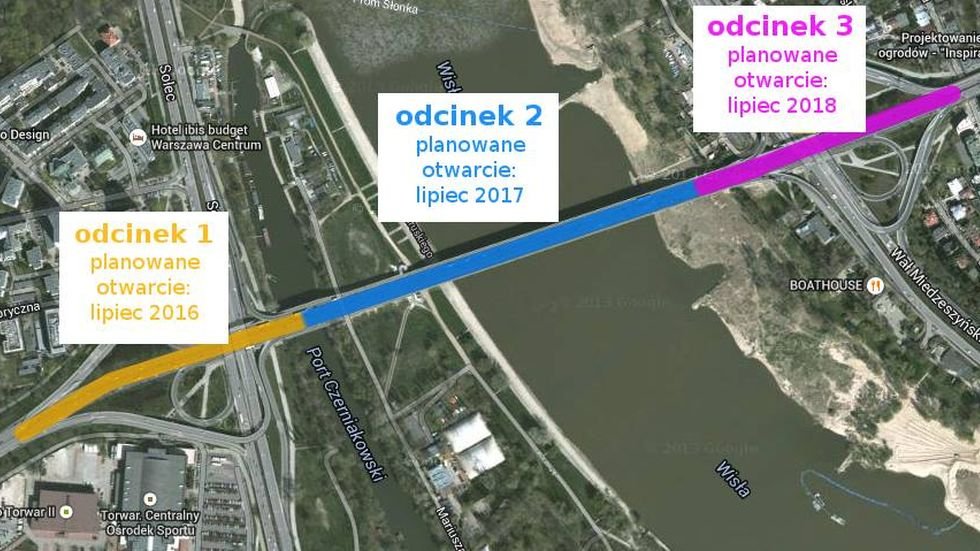 Most będzie, podobnie jak metro, oddawany etapami: pierwszym odcinkiem, do zachodniej podstawy mostu, warszawiacy pojadą już w lipcu 2016 roku, rok później zbliżą się do zjazdu po wschodniej stronie - przez rok będą musieli jednak zawracać, bo sam zjazd będzie oddany do użytku w lipcu 2018 roku.