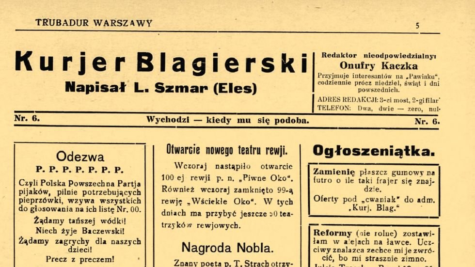 Wszystko dzięki "Kurjerowi Blagierskiemu", dodatkowi do wydawanego w latach 1926-1936 "Trubadura Warszawskiego". Redaktorem naczelnym pisma przez długi czas był satyryk Kazimierz Brzeski, właściwie Fiederbaum, co pewnie wtedy, tak jak dziś, wiele by niektórym wyjaśniało.