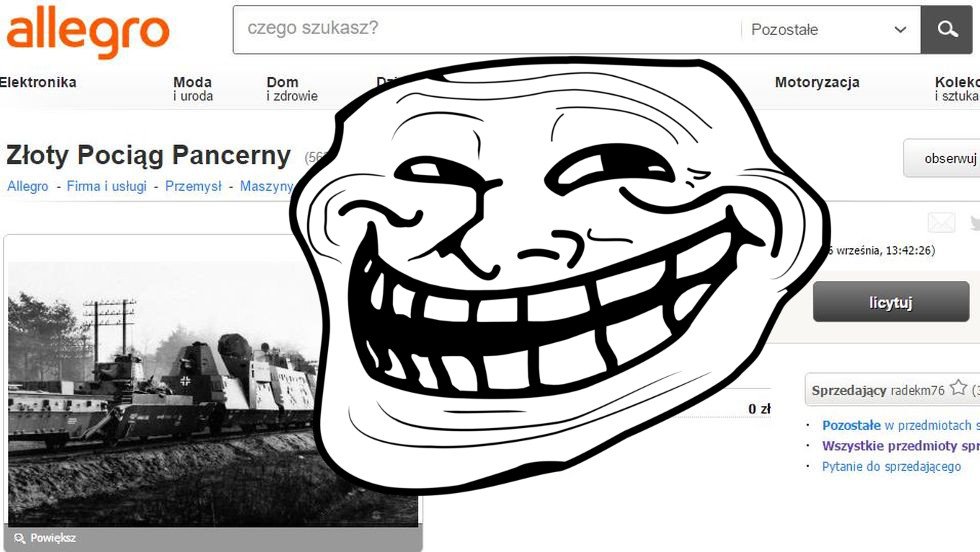– Sprzedam pociąg pancerny z czasów II Wojny Światowej. Pociąg dobrze zachowany choć do remontu generalnego – tak zaczyna się najgorętsza teraz aukcja na Allegro, którą zobaczycie dziś nie raz na swoim Facebooku.