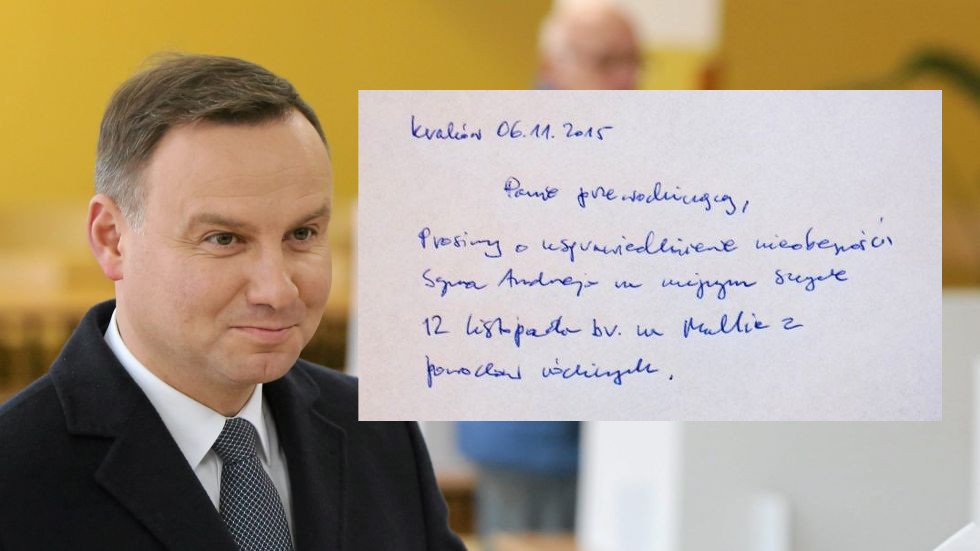 – Proszę o zwolnienie syna z obecności na szczycie na Malcie w dniu 12 listopada z powodów rodzinnych – takie usprawiedliwienie nieobecności podpisane rzekomo przez rodziców Andrzeja Dudy zamieściła na swoich stronach Kancelaria Prezydenta.