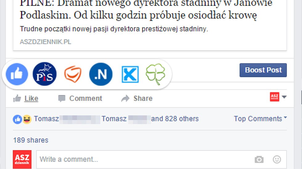 – Doceniamy też wkład w zupełnie niezmyślone burze pod zmyślonymi newsami. Dlatego od teraz każdy fan ASZa będzie mógł oznaczyć pod postem, jaka partia jest najbardziej szkalowana w artykule – dodał.