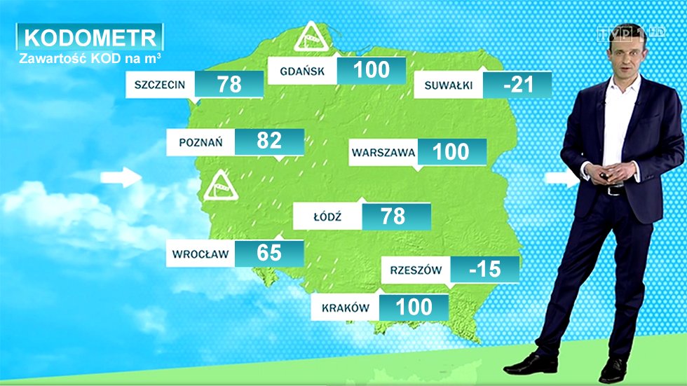 – W dniu jutrzejszym zawartość ideologii KOD-u w Trójmieście, Gdańsku i Krakowie wyniesie 100 dawek na metr sześcienny, podczas gdy w zachodniej i centralnej Polsce nie przekroczy 85. Najlepsze warunki dla #dobrejzmiany wystąpią na Podkarpaciu i Suwalszczyźnie. Tam wskaźnik KOD-u będzie ujemny – taką prognozę pogody z KODometrem po raz pierwszy zobaczyli widzowie TVP po "Wiadomościach".