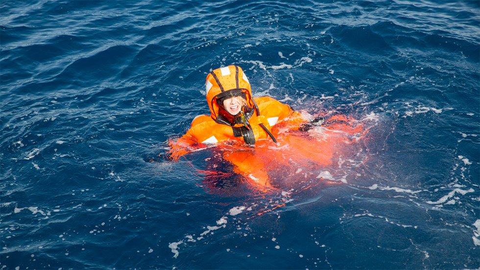Chcąc sprawdzić, jak czuje się potencjalny imigrant postanowiła wyskoczyć z łódki do morza. I popływać. W SKAFANDRZE (!!!). OCHRONNYM.