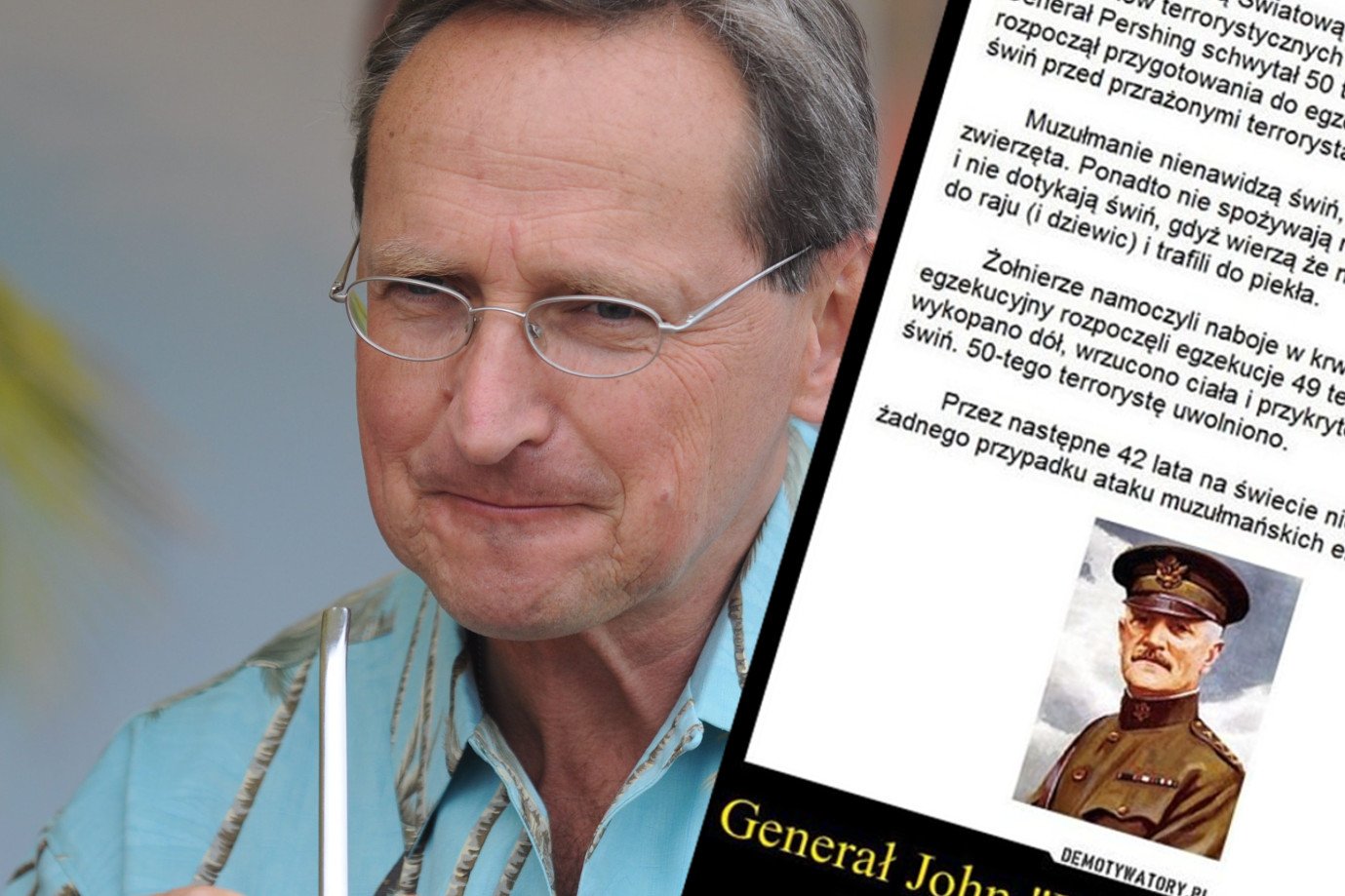 Cejrowski zagroził bowiem bezczeszczeniem zwłok dżihadystów świńską krwią. To pomysł, który dobrze znają fani Demotywatorów. Mema z wymyśloną historią o generale Pershingu, który miał stosować takie praktyki, tysiące Polaków uznało za "mocnego", prawdziwego i podało go dalej na Fejsie.