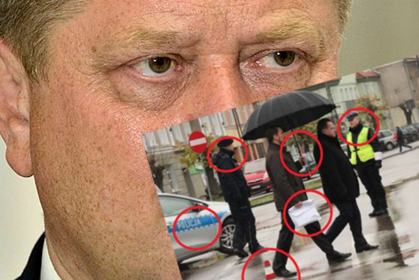 Posłuszna służba nie zważając na całe metry dzielące chodnik od drugiego wnet otoczyła orszak jednego króla policyjnym autem i drogowym pachołkiem, bo wiedzą że jak hrabia Zieliński pójdzie w Polskę, to lubi mieć takowych przy sobie.