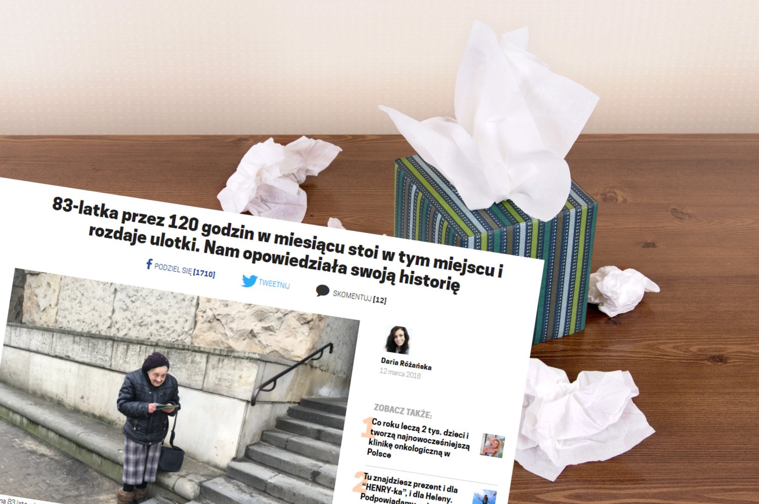 Paczka nie wystarczy, by otrzeć z policzków wszystkie łzy wzruszenia. Karton chusteczek higenicznych będzie ci potrzebny do przeczytania historii o pani Marii, 83-latce z Warszawy. Kobieta od 12 lat rozdaje ulotki na ulicy, bo musi dorobić do emerytury i komornika. Nie chce żebrać i nie oczekuje żadnej pomocy.