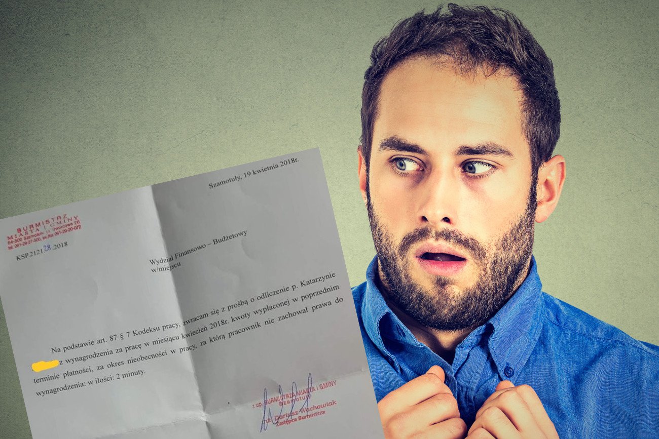 – Zwracam się z prośbą odliczenie p. Katarzynie (...) z wynagrodzenia za pracę w miesiącu kwiecień 2018 r. kwoty wypłaconej w poprzednim terminie płatności, za okres nieobecności w pracy, za którą pracownik nie zachował prawa do wynagrodzenia w ilości: 2 minuty - napisał wzorową urzędniczowszczyzną Dariusz Wachowiak, zastępca burmistrza Szamotuł.
