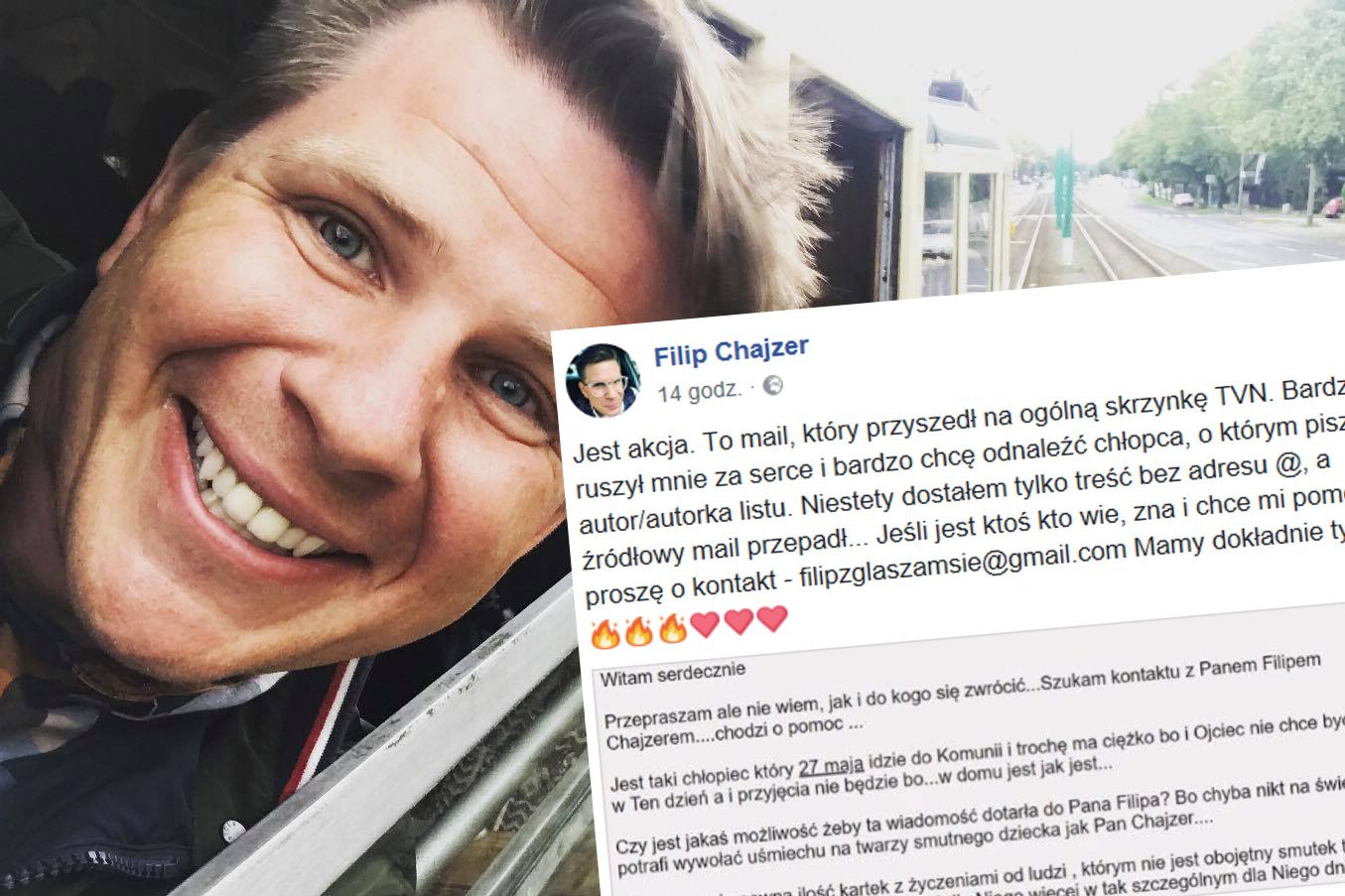 – Jest taki chłopiec, który 27 maja idzie do komunii, i trochę ma ciężko, bo i ojciec nie chce przy nim być w ten dzień, a i przyjęcia nie będzie, bo w domu jest jak jest – napisał autor lub autorka. – Czy jest taka możliwość, żeby ta wiadomość dotarła do pana Filipa Chajzera? Bo chyba nikt na świecie nie potrafi wywołać uśmiechu na twarzy smutnego dziecka jak pan Chajzer.