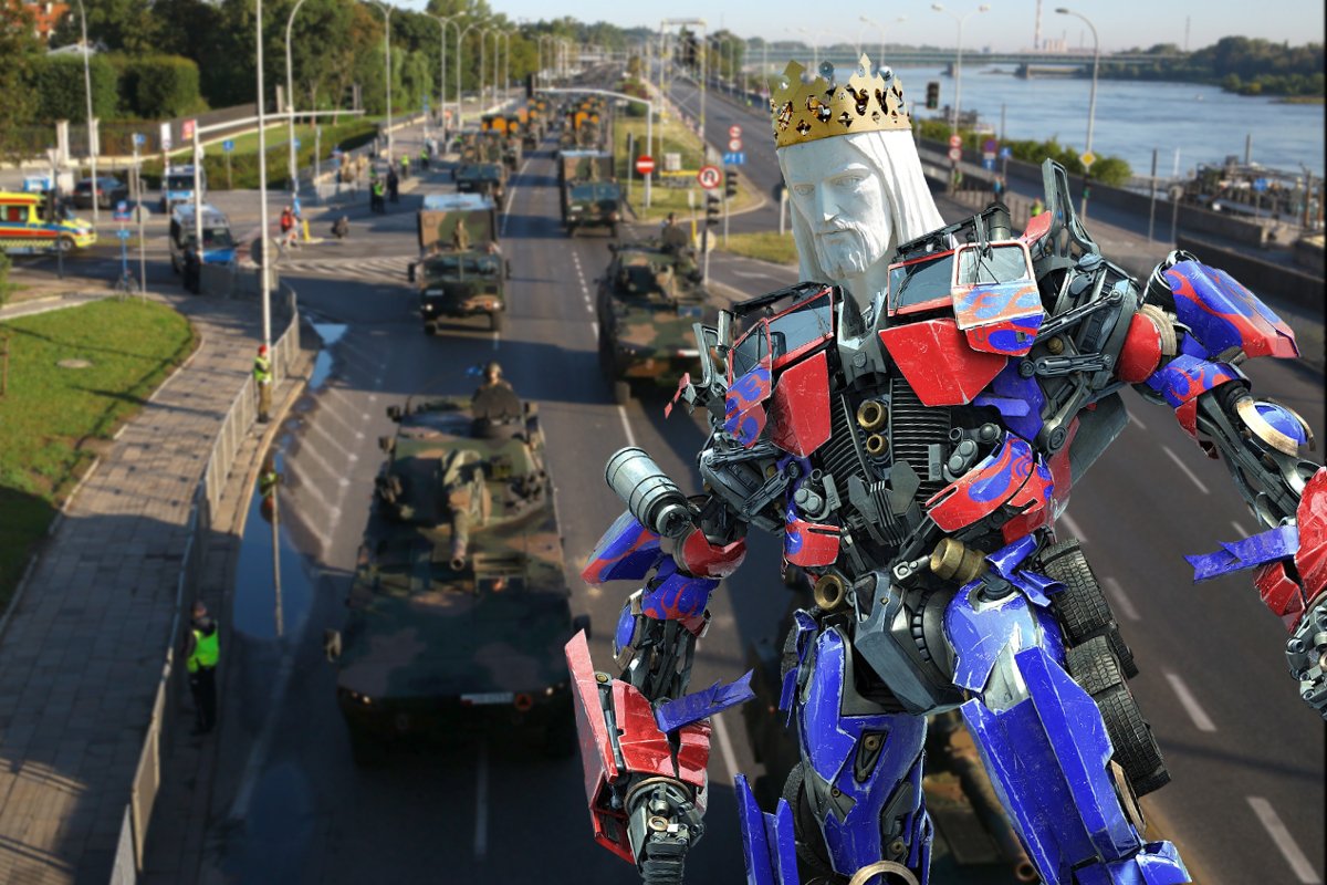 Polska wreszcie zajmie należne jej miejsce w elicie najlepiej uzbrojonych państw świata. Na defiladzie z okazji Święta Wojska Polskiego MON zaprezentowało superbroń - gigantycznego robota o obliczu Jezusa.