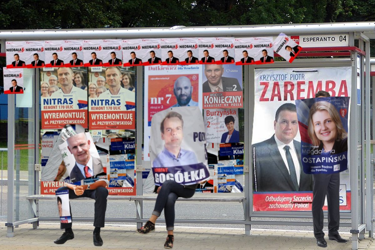 Dwóch mężczyzn i kobieta czekali wczoraj późnym wieczorem na ostatni autobus linii 111. W pewnej chwili nieznani sprawcy zaczęli rozklejać na przystanku plakaty wyborcze. Najprawdopodobniej przez nieuwagę unieruchomili postronne osoby, przyklejając je grubą warstwą makulatury do wiaty.