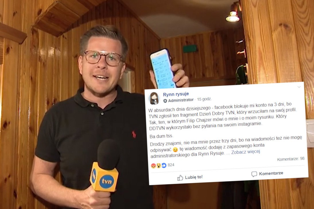 – W absurdach dnia dzisiejszego: Facebook blokuje mi konto na 3 dni, bo TVN zgłosił ten fragment Dzień Dobry TVN, który wrzuciłam na swój profil – pisze Rynn na swojej grupie. – Tak, ten, w którym Filip Chajzer mówi o mnie i o moim rysunku. Który DDTVN wykorzystało bez pytania na swoim Instagramie.