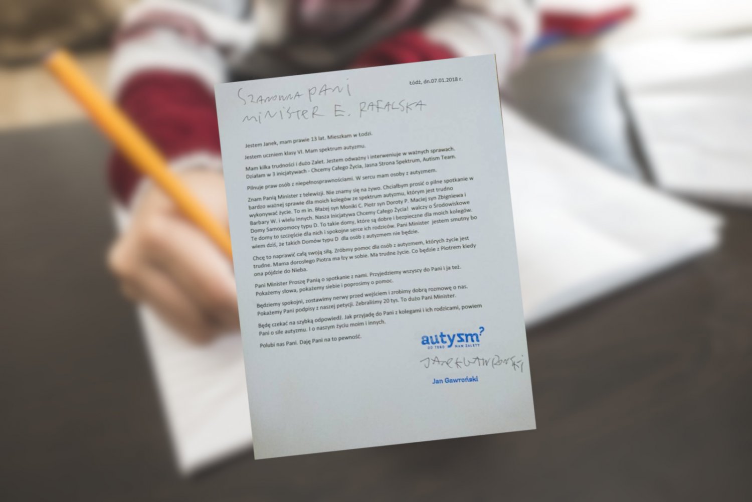 Jan Gawroński jest uczniem VI klasy w podstawówce w Łodzi. Ma spektrum autyzmu. Historia jego listu zaczyna się w grudniu 2018 roku. To wtedy rząd wycofał się z planów stworzenia sieci specjalistycznych placówek dziennej opieki dla dorosłych z autyzmem.