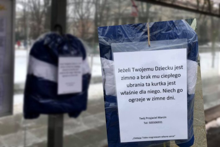 – Jeżeli Twojemu dziecku jest zimno, a brak mu ciepłego ubrania, ta kurtka jest właśnie dla niego - czytamy na 50 kurtkach, które pan Marcin wraz ze znajomymi rozwiesił na znakach drogowyc w Warszawie. – Niech je ogrzeje w zimne dni.