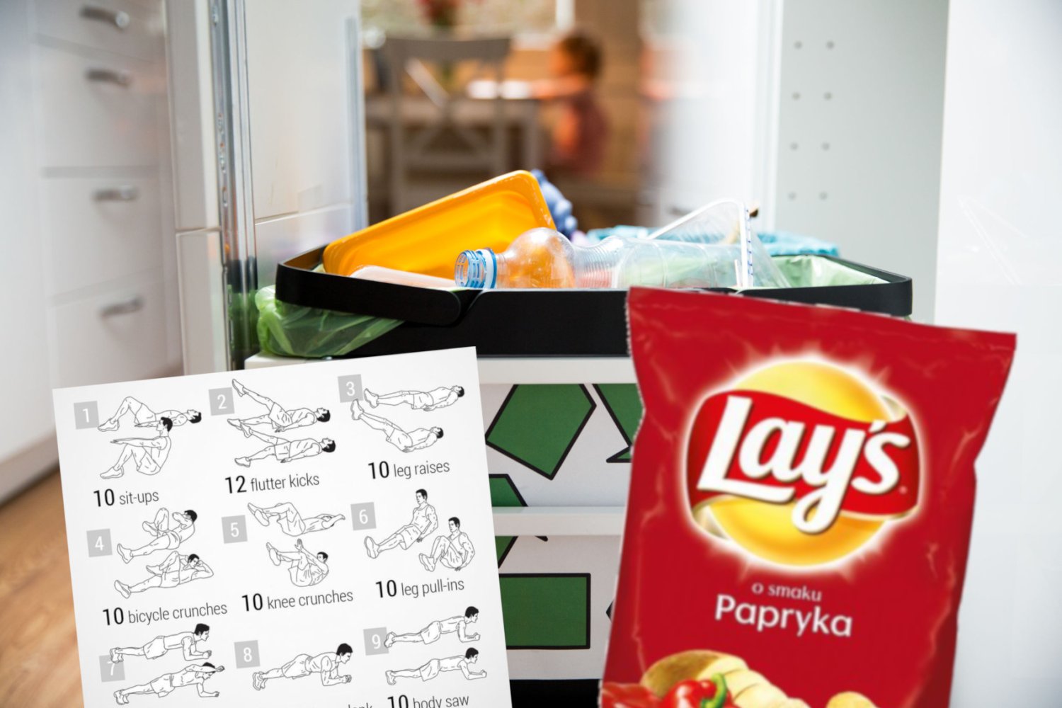 Fioletowy 35-litrowy worek na śmieci był niemym świadkiem wzruszającej sceny w kawalerce Kacpra D. z Warszawy. W koszu pod zlewem nieśmiała rozpiska z ćwiczeniami na 7 dni tygodnia wylądowała obok podekscytowanej paczki paprykowych Laysów. Ślepy los czy przeznaczenie?