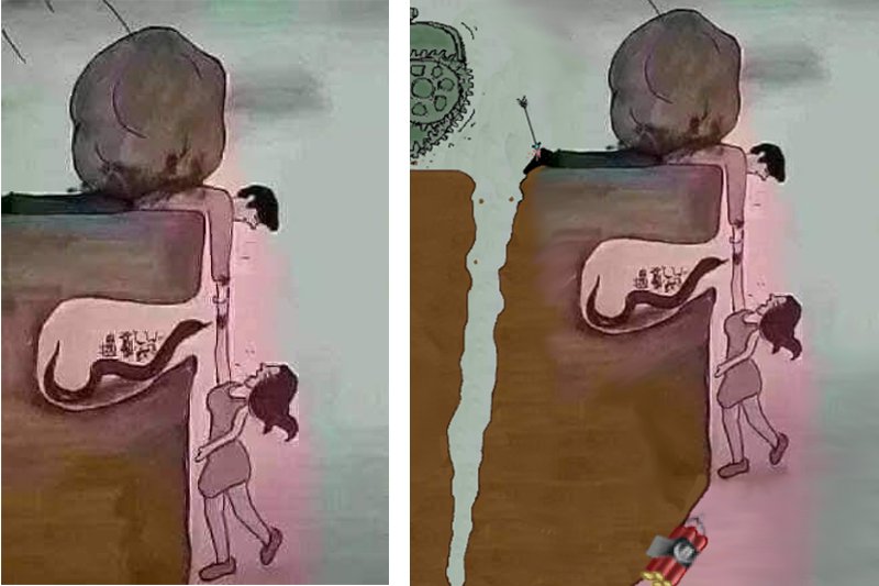 KOBIETA nie widzi kamienia, ale także wystającej ze stopy mężczyzny strzały, która symbolizuje mniejsze, ale wciąż dokuczliwe bolączki, jak kompulsywne podjadanie wieczorem albo żal po nieudanej karierze piłkarskiej. MĘŻCZYZNA wie, że jeśli pozwoli kobiecie upaść, to spadnie ona na kolce (powrót do rodziców). W dodatku do urwiska przymocowana jest bomba (spóźniający się okres), a MĘŻCZYZNĘ zaraz przejedzie czołg Panzerkampfwagen V Panther (matka). W dodatku urwisko może się zaraz pod nimi zarwać (są do siebie kompletnie niedopasowani).