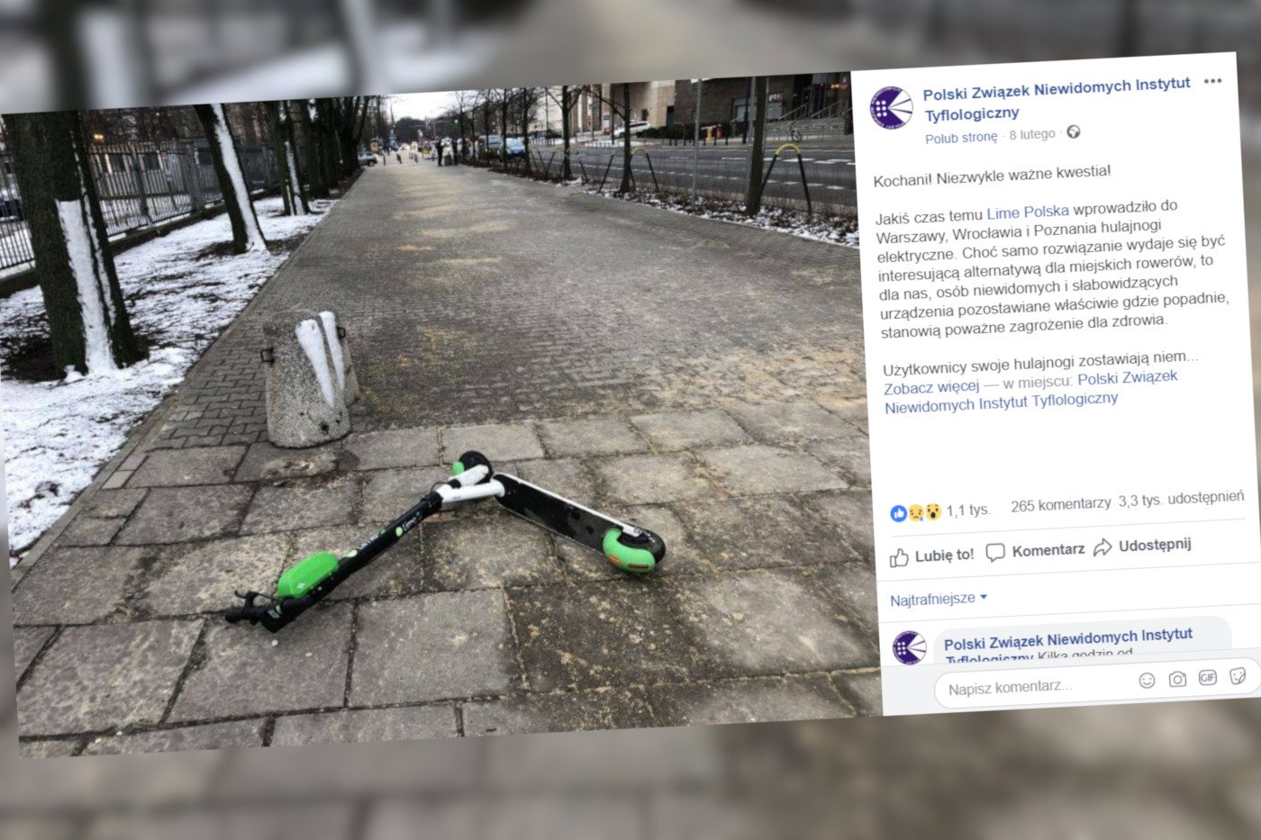 O sprawie miejskich hulajnóg od firmy Lime Polska porzucanych na chodnikach byle jak zaalarmowały Polski Związek Niewidomych, strona "Niewidzialnej Wystawy" i "Ścieżki Dostępu".