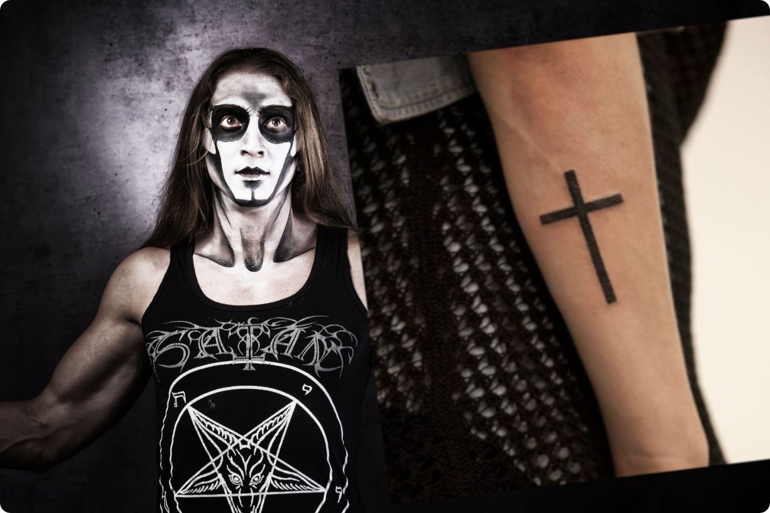 Mężczyzna tak ostro chciał wyrazić swój sprzeciw przeciwko normom narzucanym społeczeństwu przez Katolicki Kościół, że krzyż na swoim satanistycznym tatuażu postanowił odwrócić podwójnie.