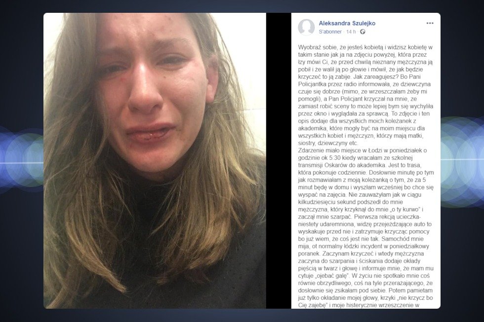 A rzeczywistość wygląda tak, jak opisała to wczoraj na Facebooku Aleksandra Szulejko, studentka z Łodzi, którą obcy mężczyzna złapał na ulicy, zaczął ją szarpać, bić po twarzy i głowie, próbował zgwałcić i groził, że jak będzie krzyczeć, to "ją zajebie".