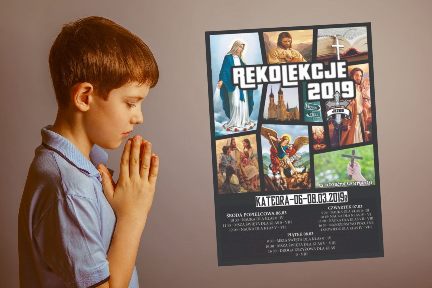 Na plakacie promującym rekolekcje dla uczniów podstawówek miejsce gangsterki w bikini zajęła Najświętsza Maryja Panna, zamiast śmigłowca szturmowego z działkami Gatlinga M197 widzimy Biblię uzbrojoną w różaniec, socjopata Trevor z GTAV to w wersji radomskiej Jezus Chrystus z dzieckiem na rękach, a scenę z brutalnych wojen narkotykowych zastąpił archanioł Michał walczący z szatanem i jego pokusami.