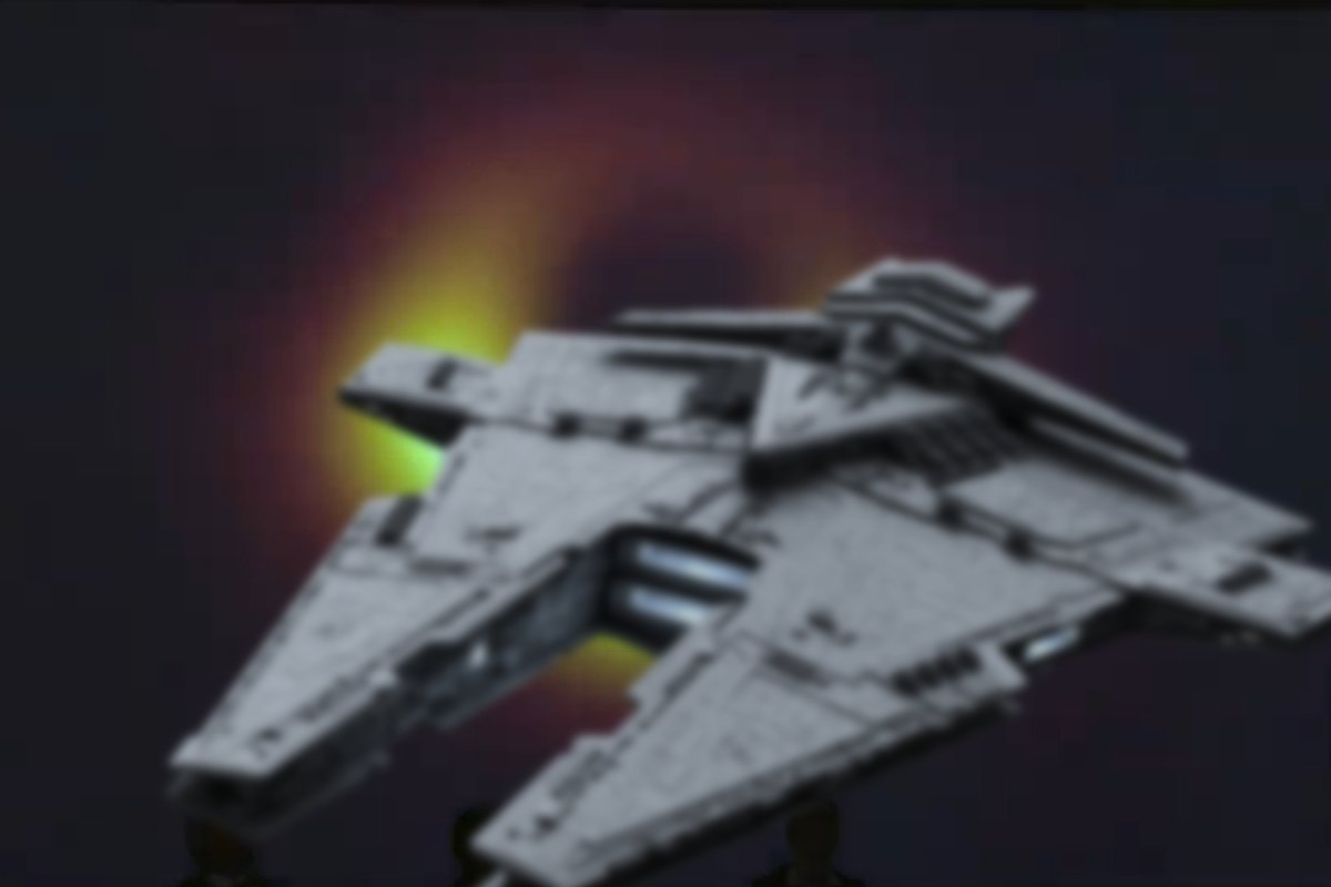 Czarna dziura, a właściwie otaczający ją horyzont zdarzeń, została na fotografii w większości przesłonięta przez statek kosmiczny zidentyfikowany jako ciężki imperialny krążownik Harrower IV.