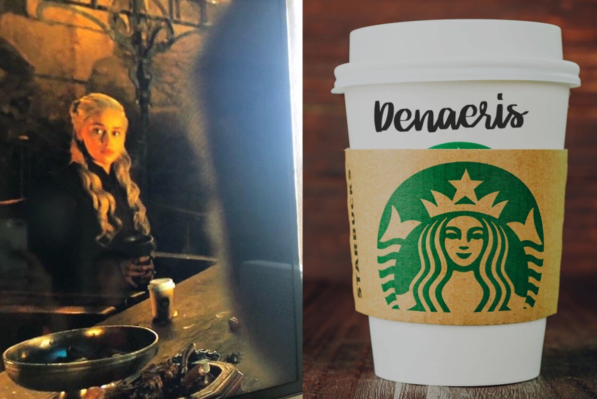W sieci krąży stopklatka sceny z najnowszego epizodu, w której bohaterowie najwyraźniej opijają zwycięstwo nad Nocnym Królem. Na pierwszym planie widać Jona i Tormunda, w tle zaś siedzi Daenerys, która popija waniliowe latte z kubka ze Starbucksa. Imię, które na nim widnieje, brzmi "Denaeris".