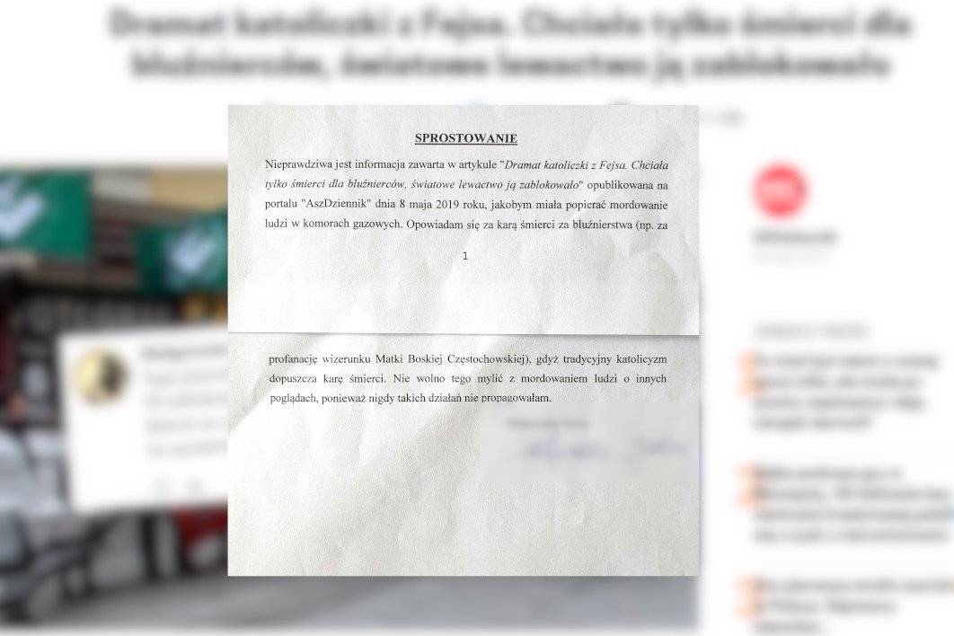 Zamieszczamy sprostowanie do artykułu "Dramat katoliczki z Fejsa. Chciała tylko śmierci dla bluźnierców, światowe lewactwo ją zablokowało." Sprostowanie jest prawdziwe. Sprawdzaliśmy kilka razy.