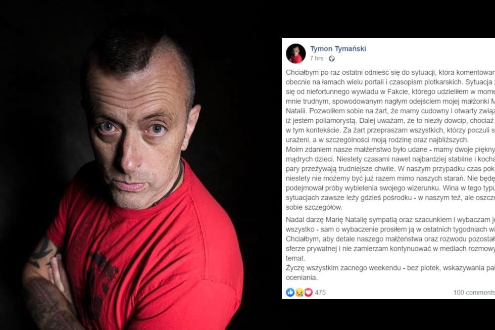 A kiedy okazało się, że żona o tym nie wiedziała, a za to teraz wie cała Polska, Tymański opublikował na swoim Facebooku oświadczenie o tym, że on to tak sobie tylko żartował.