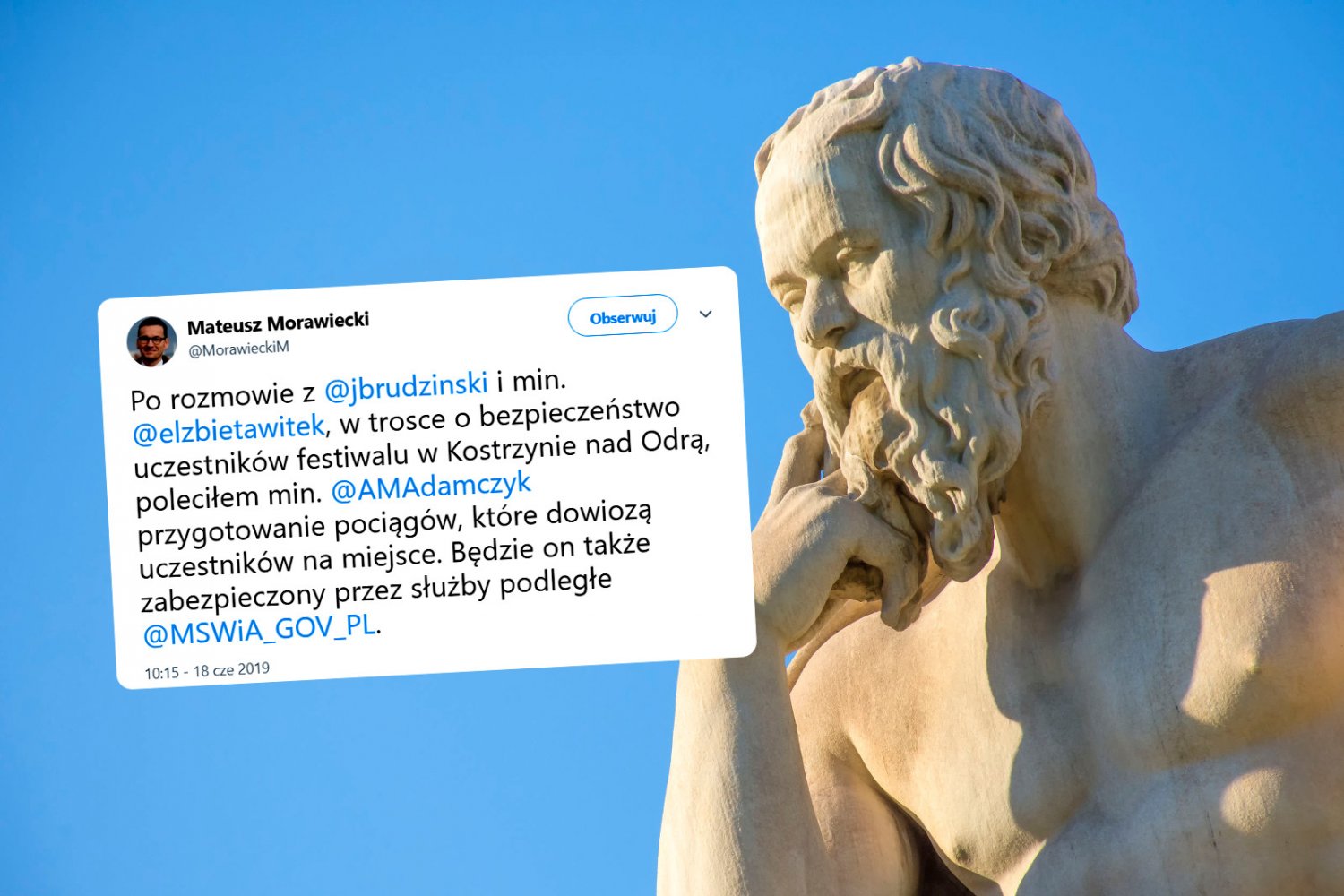 – Po rozmowie z Joachimem Brudzińskim i Elżbietą Witek, w trosce o bezpieczeństwo uczestników festiwalu w Kostrzynie nad Odrą, poleciłem Andrzejowi Adamczykowi przygotowanie pociągów, które dowiozą uczestników na miejsce - napisał na Twitterze premier rządu, którego ludzie w państwowych spółkach zignorowali bezpieczeństwo uczestników festiwalu w Kostrzynie nad Odrą i polecili odwołanie pociągów, które miały dowieźć uczestników na miejsce.