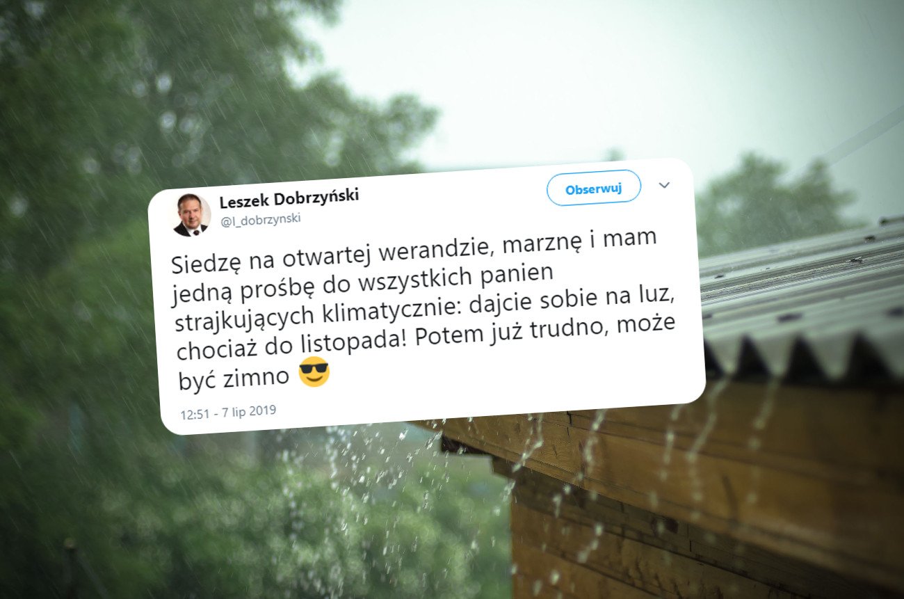 – Siedzę na otwartej werandzie, marznę – napisał poseł Dobrzyński na Twitterze. – I mam jedną prośbę do wszystkich panien strajkujących klimatycznie: dajcie sobie na luz, chociaż do listopada! Potem już trudno, może być zimno – dodał, bo klimat to to samo co pogoda.