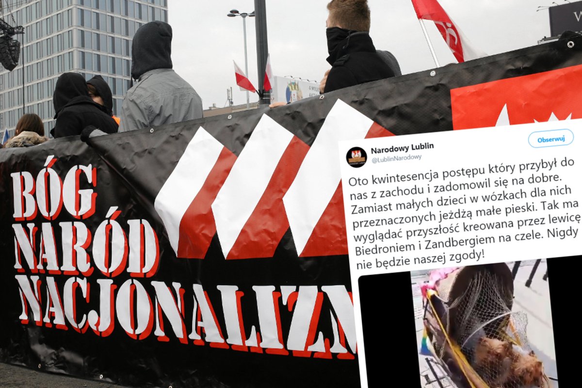 Narodowy Lublin opublikował na Twitterze filmik, na którym widać dziecięcy wózek, a w nim, zamiast polskiego bombelka siedzą dwa małe, yorkopodobne pieski. W nagraniu komentarz operatora telefonu jest mocno entuzjastyczny ("Ale fajnie to wygląda!"), komentarz narodowców już mniej.