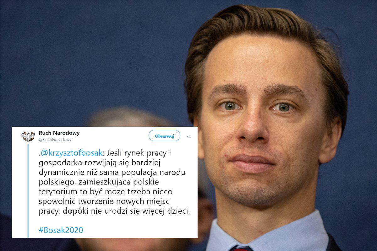 - Nie jest tak, że rynek pracy ma nam dyktować co mamy robić ze swoim państwem. Musimy być gotowi prowadzić państwo przy pomocy swoich własnych obywateli - powiedział Bosak. - Jeśli rynek pracy i gospodarka rozwijają się bardziej dynamicznie niż sama populacja narodu polskiego, zamieszkująca polskie terytorium to być może trzeba nieco spowolnić tworzenie nowych miejsc pracy, dopóki nie urodzi się więcej dzieci.