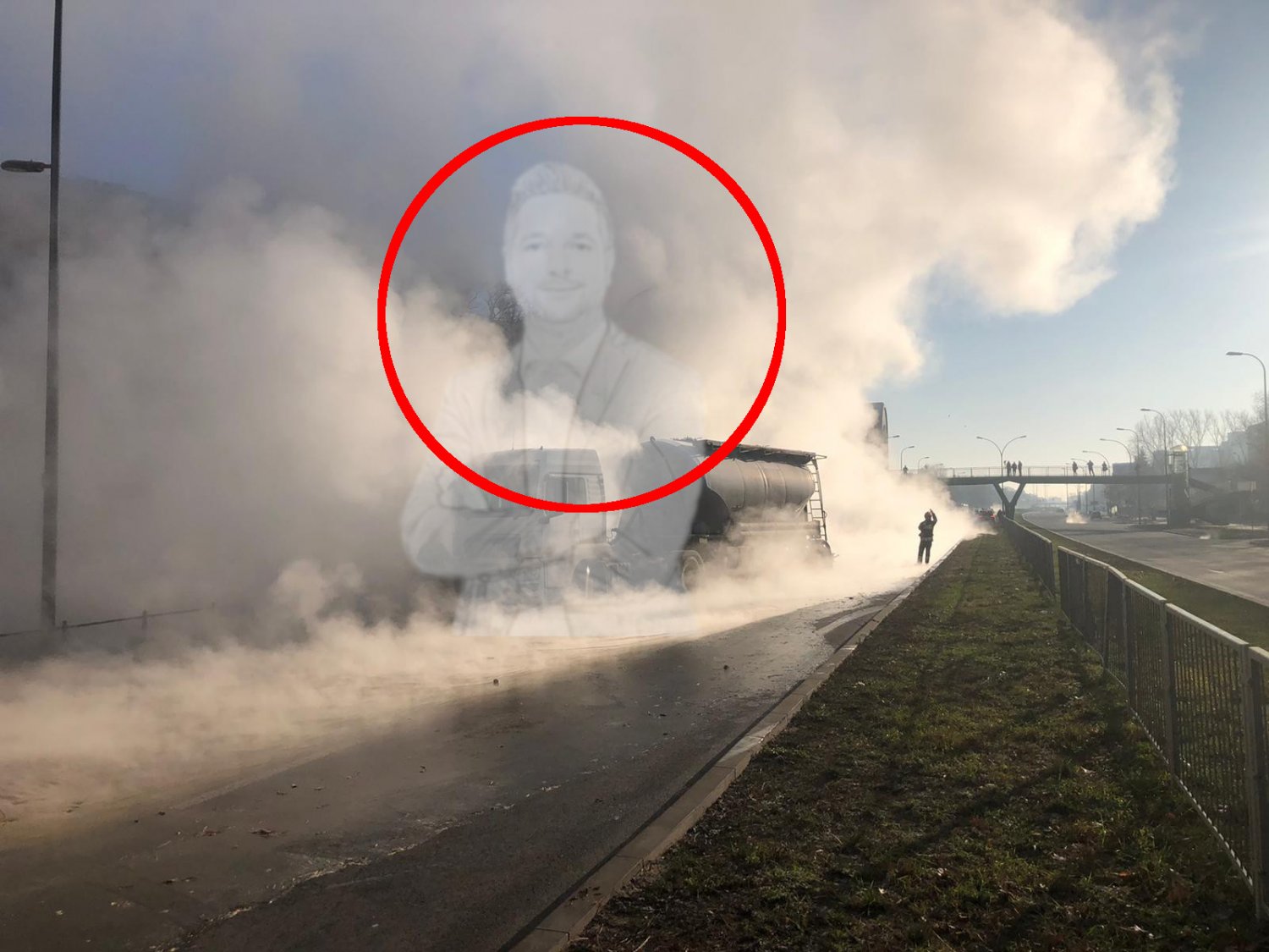 Na zdjęciu wyraźnie widać, jak w parze wydobywającej się z pękniętej rury unosi się podobizna Patryka Jakiego.
