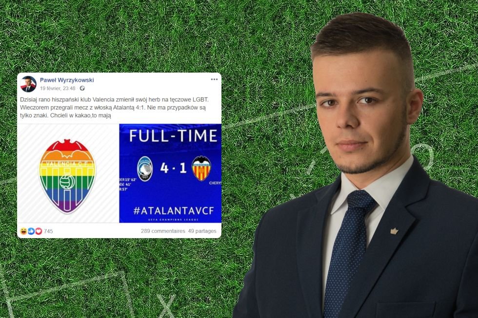 "Dzisiaj rano hiszpański klub Valencia zmienił swój herb na tęczowe LGBT" - napisał Wyrzykowski, odnosząc się do posta Valencii na Facebooku, w którym klub umieścił tęczową wersję swojego logo. - "Wieczorem przegrali mecz z włoską Atalantą 4:1. Nie ma przypadków są tylko znaki. Chcieli w kakao, to mają."