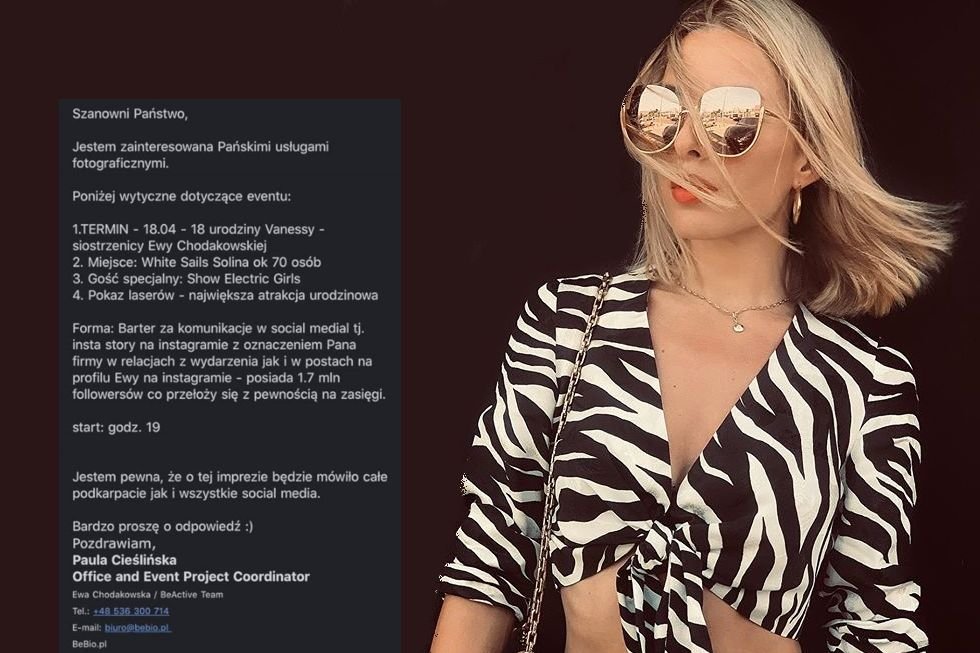 "Forma: Barter za komunikację w social media, tj. instastory na instagramie z oznaczeniem Pana firmy w relacjach z wydarzenia, jak i w postach na profilu Ewy na instagramie - posiada 1,7 mln followersów co przełoży się z pewnością na zasięgi" - kusi zespół Chodakowskiej, który wie, że płacenie za pracę to nieistotny konstrukt społeczny z XIX wieku.