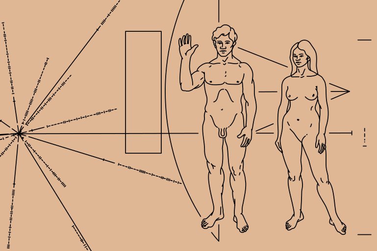 Na płytkach wyryto rysunkowe przedstawienie nagiej kobiety i mężczyzny.