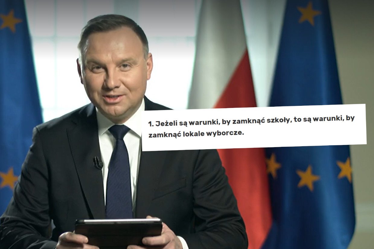 Panie Prezydencie, przez przypadek powiedział Pan podczas streamu na Fejsie, że "jeżeli są warunki, by chodzić do sklepu, to są warunki, by pójść do lokalu wyborczego". Hehe. To nic, każdemu się zdarza. To nic strasznego. Poprawiliśmy Panu ten cytat, żeby nie brzmiał tak głupio. Nie ma za co.