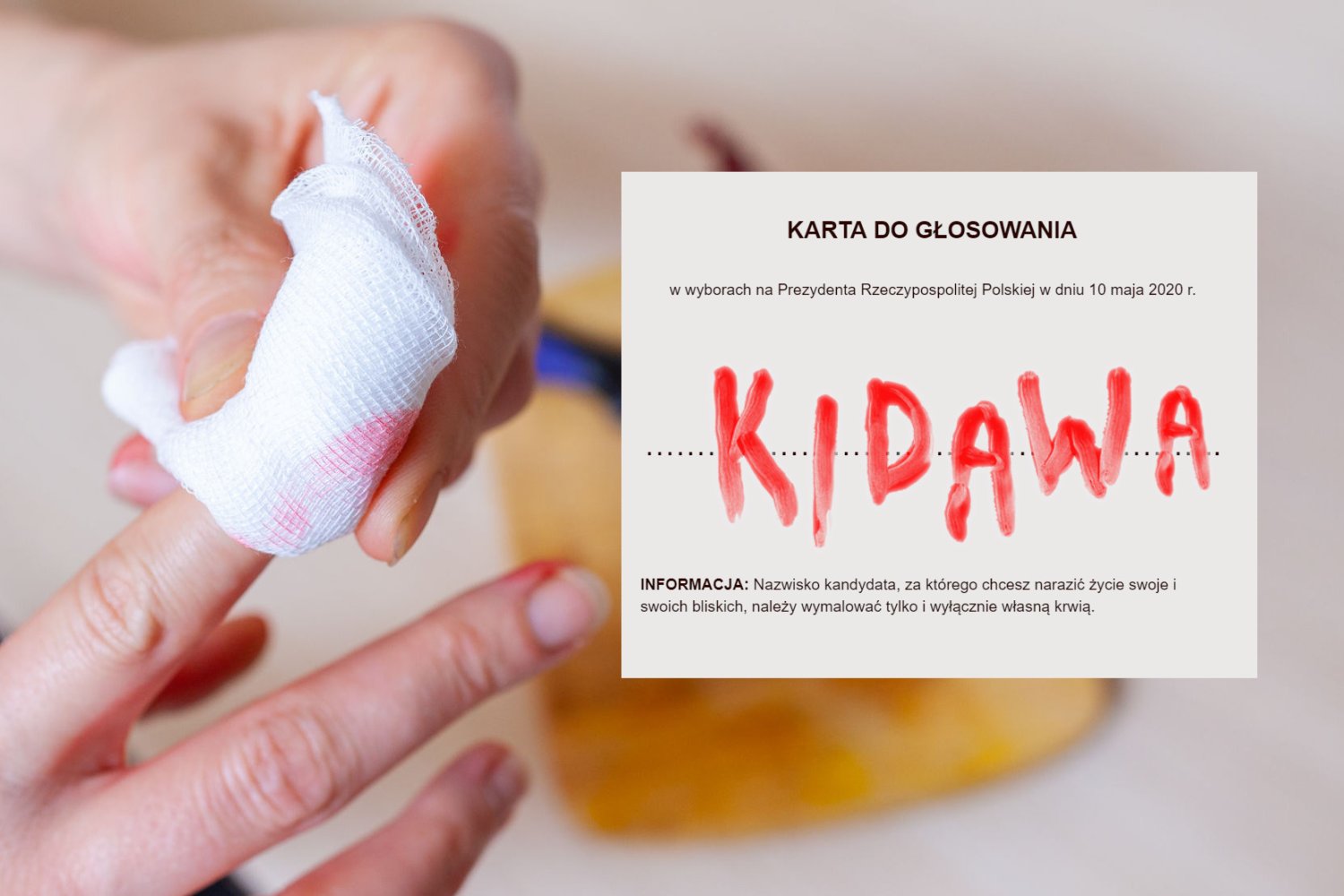 - Głosowanie korespondencyjne będzie łatwe - usłyszeliśmy od osoby związanej z projektem. - Po otrzymaniu pakietu i nacięciu palca wskazującego, smarujemy krwią nazwisko wybranego kandydata. Następnie wkładamy kartę do specjalnej koperty i ją zaklejamy.