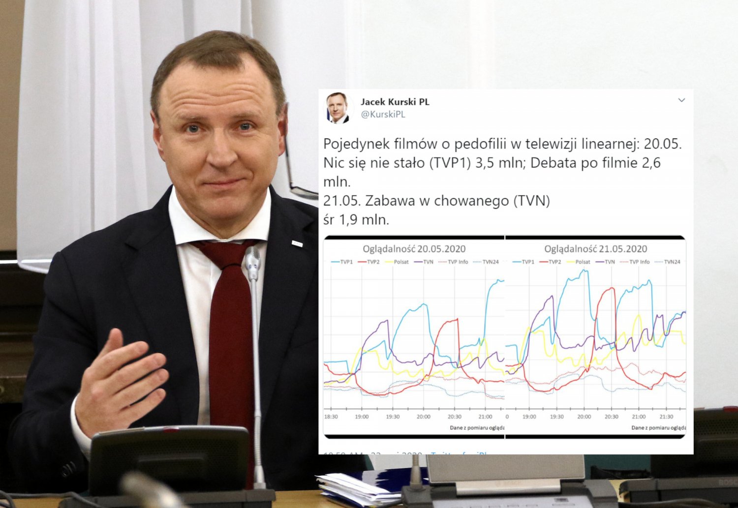 - Pojedynek filmów o pedofilii w telewizji linearnej: 20.05. Nic się nie stało (TVP1) 3,5 mln; Debata po filmie 2,6 mln, 21.05. Zabawa w chowanego (TVN) śr 1,9 mln - napisał Jacek Kurski, tłumacząc ofiarom pedofilii, że były Jackowi Kurskiemu bardzo potrzebne do dobrych statystyk.
