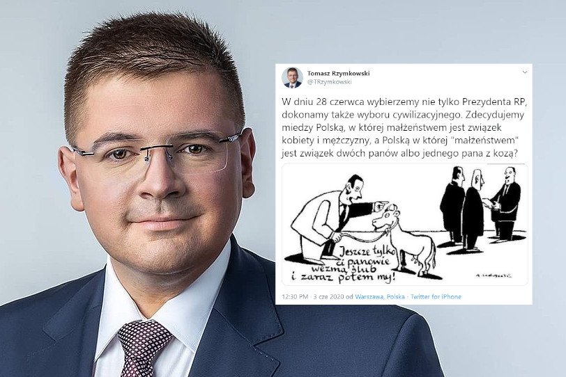 - W dniu 28 czerwca wybierzemy nie tylko Prezydenta RP, dokonamy także wyboru cywilizacyjnego. Zdecydujemy miedzy Polską, w której małżeństwem jest związek kobiety i mężczyzny, a Polską w której "małżeństwem" jest związek dwóch panów albo jednego pana z kozą? - napisał Rzymowski na Twitterze.