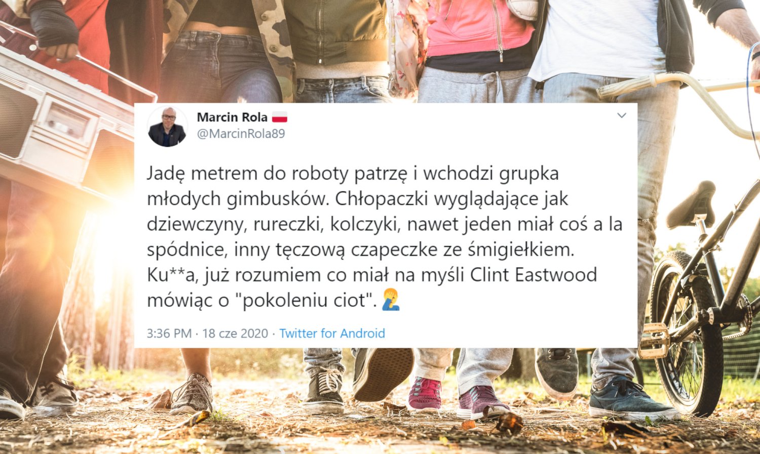 - Chłopaczki wyglądające jak dziewczyny, rureczki, kolczyki, nawet jeden miał coś a la spódnice, inny tęczową czapeczkę ze śmigiełkiem. Ku**a, już rozumiem co miał na myśli Clint Eastwood mówiąc o "pokoleniu ciot" - dodał, wyraźnie pobudzony widokiem, wcale niehomofobiczny Rola, którego męskość ucierpiała na widok śmigiełka.