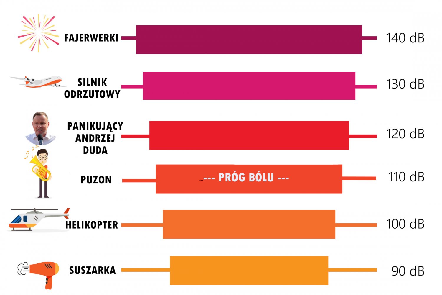 - O ile 10 decybeli to szelest liści przy łagodnym wietrze, a próg bólu zaczyna się powyżej 100 decybeli i słuchanego z bliska puzonu, to niepewny, spanikowany i wystraszony Andrzej Duda zbliżył się do dźwięku wydawanego przez startujący samolot - powiedział nam dr Tomasz Rafalski, laryngolog z Uniwersytetu Medycznego w Warszawie.