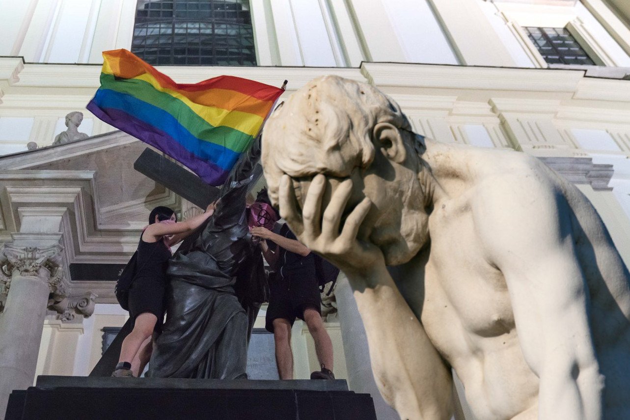 Na Krakowskim Przedmieściu w Warszawie ktoś powiesił tęczową flagę na pomniku Jezusa Chrystusa. Jeżeli uważasz, że pomnikom to nie przeszkadza, bo generalnie to są z granitu czy marmuru, to zapewne nie znasz podstawowych faktów o tym, jak żyje im się w Polsce. Oto tekst, który powinien otworzyć ci oczy.