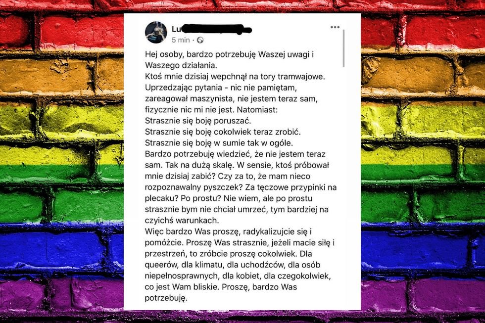 "Ktoś mnie dzisiaj wepchnął na tory tramwajowe. Uprzedzając pytania - nic nie pamiętam, zareagował maszynista, nie jestem teraz sam, fizycznie nic mi nie jest. Natomiast: Strasznie się boję poruszać. Strasznie się boję cokolwiek teraz zrobić. Strasznie się boję w sumie tak w ogóle" - pisze na Facebooku Lu.