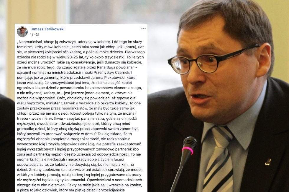 „Neomarksiści, chcąc ją [rodzinę] zniszczyć, uderzają w kobietę. I do tego im służy feminizm, który mówi kobiecie: jesteś taka sama jak chłop. Idź i pracuj, ucz się, w pierwszej kolejności rób karierę, a później może dziecko. Pierwszego dziecka nie rodzi się w wieku 20-25 lat, tylko około trzydziestki. To ile tych dzieci można urodzić? Takie są konsekwencje, jeśli tłumaczy się kobiecie, że nie musi robić tego, do czego została przez Pana Boga powołana” - oto mądrość Czarnka, którą rozbił w proch Terlikowski.