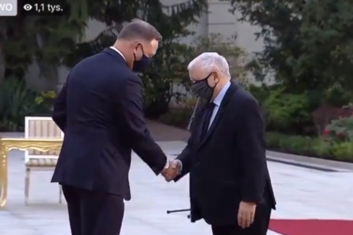 O tym, że COVID-19 boleśnie zmienił rzeczywistość, przekonał się dziś prezydent Andrzej Duda. Co prawda zdjął rękawiczkę, by podać dłoń Jarosławowi Kaczyńskiemu, ale ze względów sanitarnych nie mogło dojść do pocałunku.