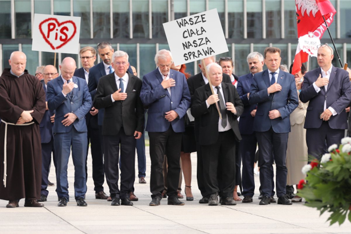 Grupa kilkudziesięciu osób - polityków PiS i duchownych - zgromadziła się wokół Jarosława Kaczyńskiego na placu Piłsudskiego w Warszawie. Protestujący przynieśli ze sobą transparenty z takimi hasłami jak "Raj mężczyzn", "Biskupie, mam cię w sercu", "Rząd jak ciąża - nie da się usunąć" czy "Kochać PiS", czasem zapisywane jako dziewięć gwiazd (****** ***).