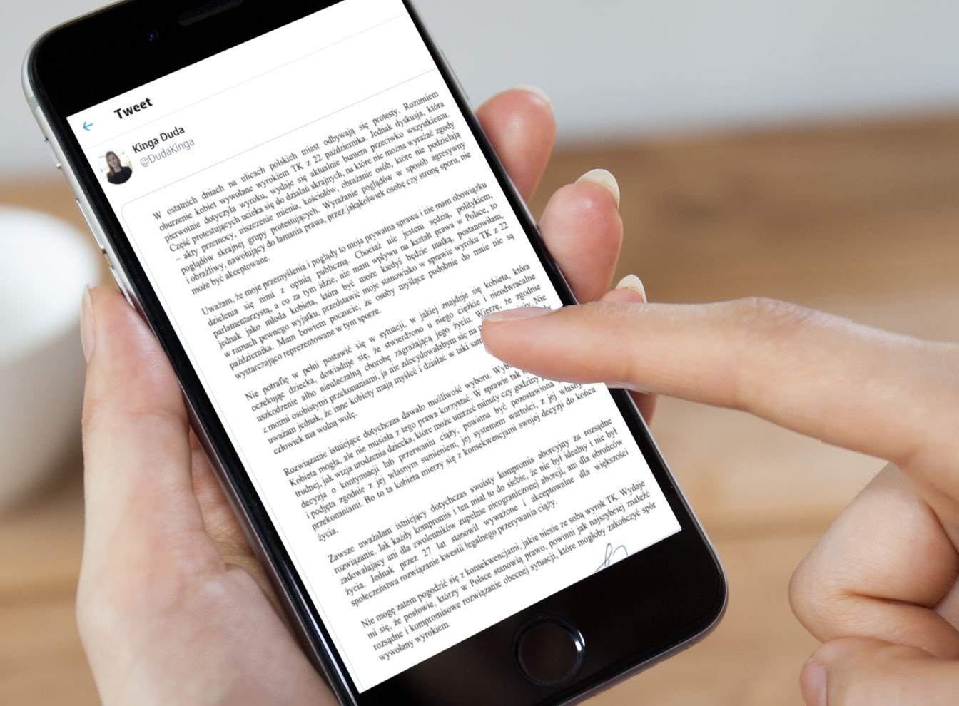 - W sprawie tak niewyobrażalnie trudnej, jak wizja urodzenia dziecka, które może umrzeć minuty czy godzinę po porodzie, decyzja o kontynuacji lub przerwaniu ciąży, powinna być pozostawiona kobiecie i podjęta zgodnie z jej własnym sumieniem, jej systemem wartości, z jej własnymi przekonaniami - pisze Kinga Duda i zaczyna namawiać do powrotu do tzw. "kompromisu aborcyjnego"