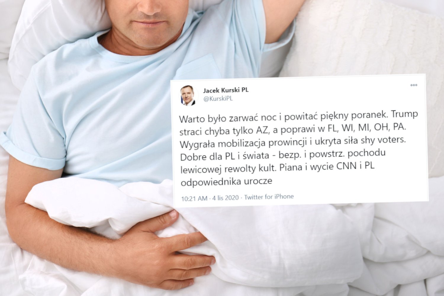 - Trump straci chyba tylko AZ, a poprawi w FL, WI, MI, OH, PA - powiedział Jacek Kurski, zanim ułożył się pod kołdrą.